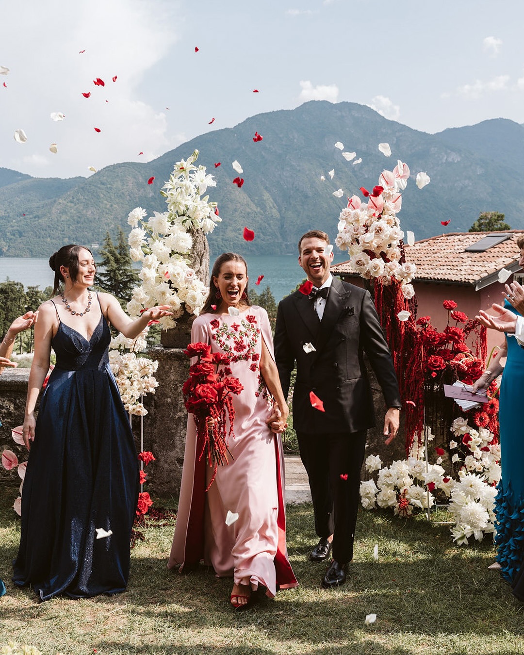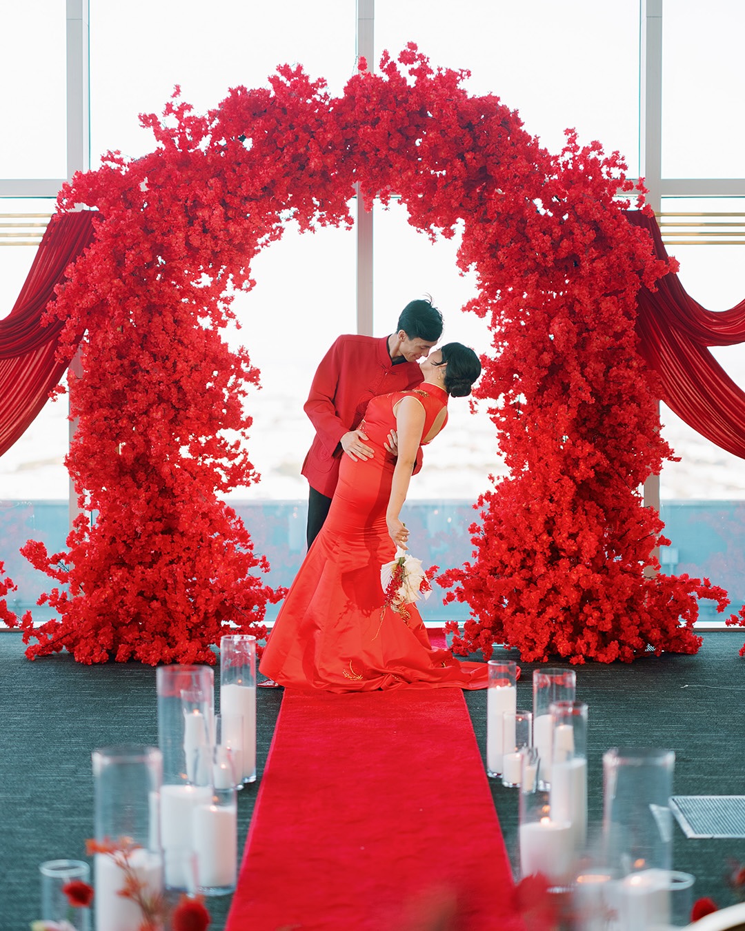 Un look para los novios con colores acordes a este día, será fascinantes. La novia puede usar un vestido rojo y el novio un boutonniere y accesorios del mismo tono. Incluso hasta las damas de honor y best men pueden participar.